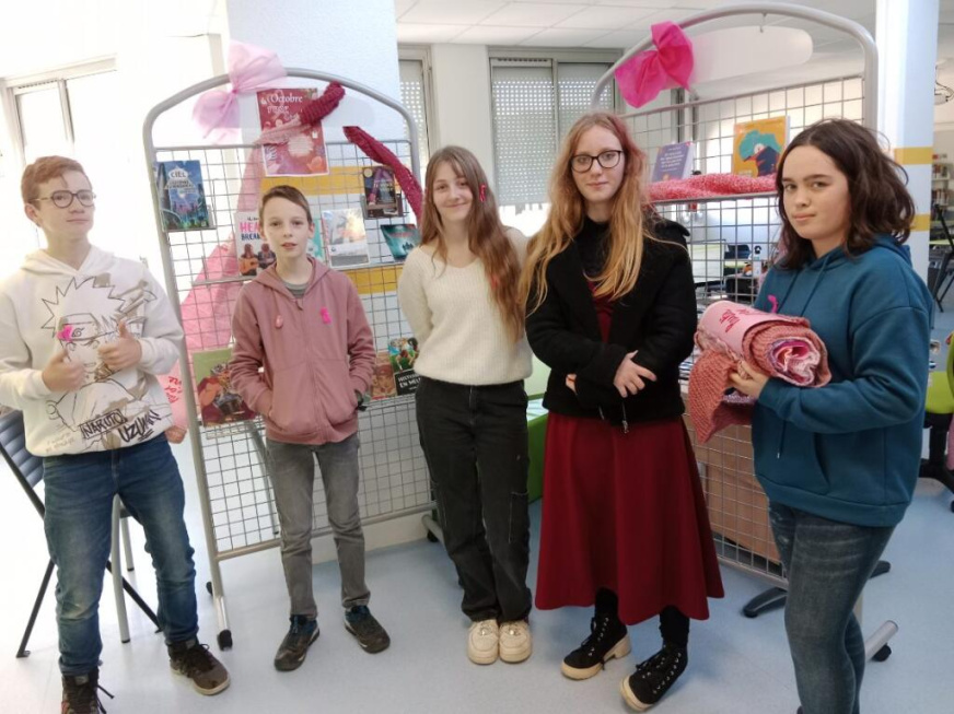 En parallèle, une banderole a été confectionnée avec le concours de Mme Cadoret Fabienne, enseignante documentaliste, qui anime un club-tricot toutes les semaines. Les élèves volontaires du club ont fabriqué des bracelets roses pour tous les enseignants et les personnels et ont aidé à coudre des petits rubans qui ont été distribués avant de prendre la photo, devant la banderole géante, tricotée et crochetée par Mme Cadoret grâce à la laine de certains élèves et collègues. Ce moment se poursuivra dimanche, car certains d’entre eux participeront à la « Josselinaise des femmes ». Beaucoup d’élèves sont touchés par cette cause, car elle raisonne bien souvent dans leurs familles malheureusement. Une sélection d’ouvrages (romans, bandes dessinées et livres documentaires) avait aussi été faite au CDI, devant laquelle certains élèves du Club-lecture posent avec la banderole, avant de rejoindre tous les élèves dans la cour.